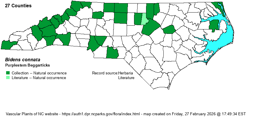 | Distribution | Weakley (2020) splits this taxon out from B. comosa, which was also split out a while back from B. tripartita! Thus, this species complex is somewhat unsettled, though B. connata is a long-recognized name from decades ago. Weakley (2024) considers it as occurring nearly statewide. The map below is perhaps incomplete, or it may well include some specimens labelled as "B. connata" that might be B. comosa instead.