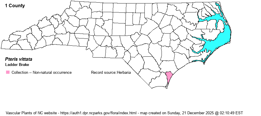 | Distribution | Known only from masonry at two sites in Wilmington, in New Hanover County. Collections from 1981 and 2013; however, it seems likely that these were included within P. multifida, as there seems some confusion among the many Wilmington masonry specimens of both of these two exotic fern species!