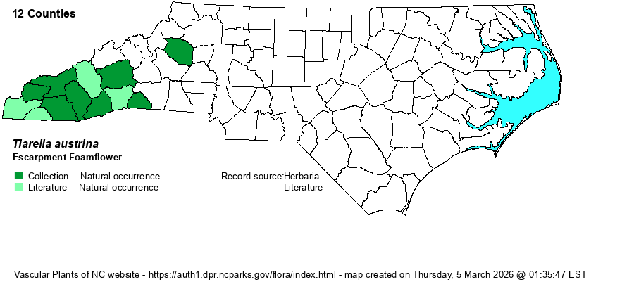 | Habitat | Rich hardwood forests, cove forests, and similar hardwood forests. Note that habitat distinctions among the four species of Tiarella in NC have not been described, as Weakley's (2024) habitat listings are identical for all four (for now). | |