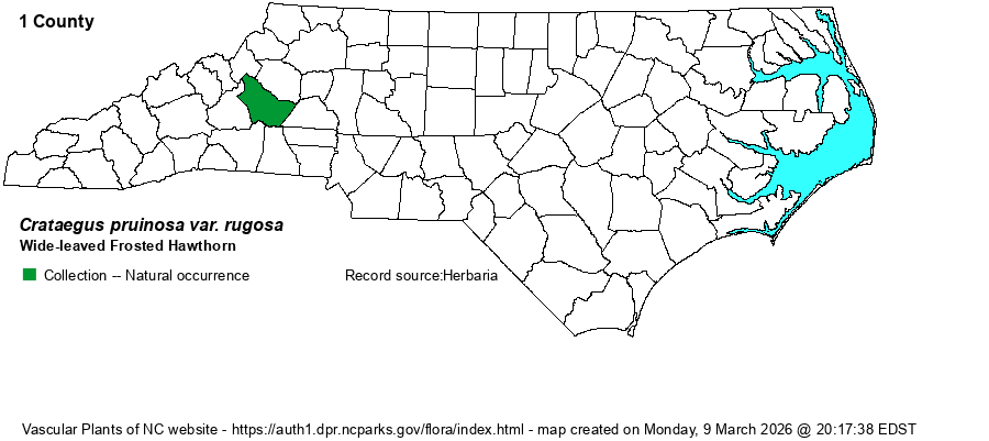 | Crataegus pruinosa var. rugosa | > | Crataegus pruinosa var. pruinosa | Fernald (1950) | |