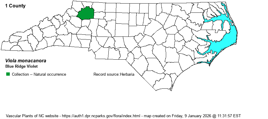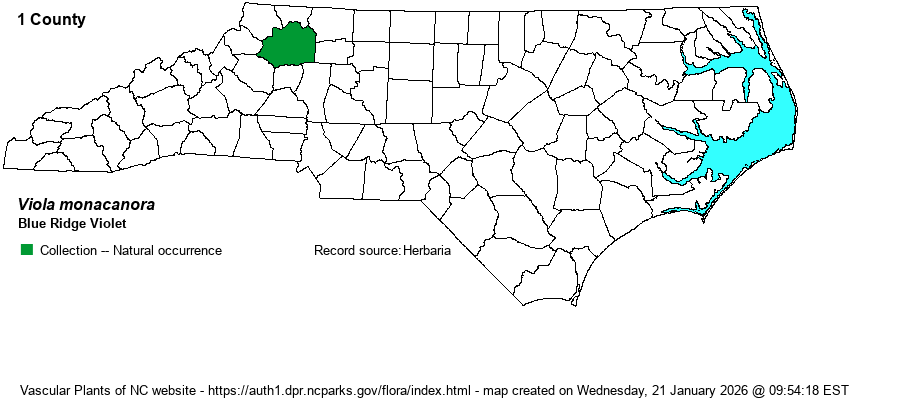 | Distribution | This is a recently described species (by Ballard et al., 2023) and is split from the formerly large and confusing V. palmata complex. So far, collected only from Wilkes County, in the Brushy Mountains, in 1956; a SERNEC specimen from Haywood in 1950 might be correct but it is not within the expected range, but might be the more likely V. subsinuata. To be looked for in the northern Mountains, as well.