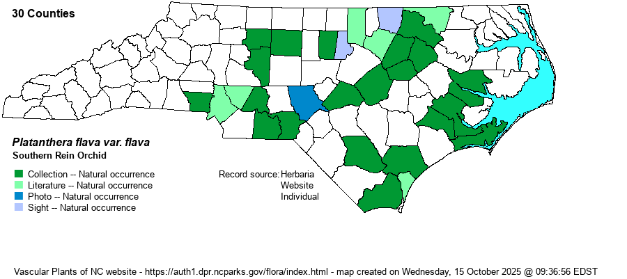 Habitat | This is a Platanthera of wet shaded habitats, being most often found in brownwater floodplain pools and other wet ground in lowland hardwood forests and bottomlands. It grows in a few similar habitats to P. clavellata, though that species has a wider range of moist habitats and does not grow in as dense stands as can P. flava var. flava. | |