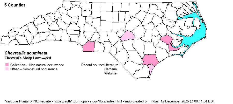 | Distribution | This South American composite has recently (2010s and later) been discovered at a handful of sites in the Southeastern states, mostly in lawns. In NC, first reported only in 2023, in a lawn in Harnett County; photos and comments are on Facebook Carolina Flora. In addition, the iNaturalist website now has a photo accepted record for New Hanover County, in June 2023. The species was reported on Facebook also for Cabarrus County, but until photos or specimen are posted for review and acceptance, this county is not being added to the map below. A specimen from Union County was made in 2024. A paper published in Castanea 88: 211-213 reports this alien from lawns in Craven and Pender counties in 2023 and 2021, respectively); specimens at NCSC. These records suggest that this species has become firmly established in the NC southeastern Coastal Plain, at least.