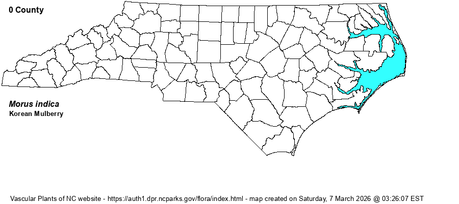 "Native of e. Asia. Reported by Barger et al. (2023) as being well-established in Alabama, and likely widespread in the Southeast, but overlooked because not distinguished from M. alba" (Weakley 2025).