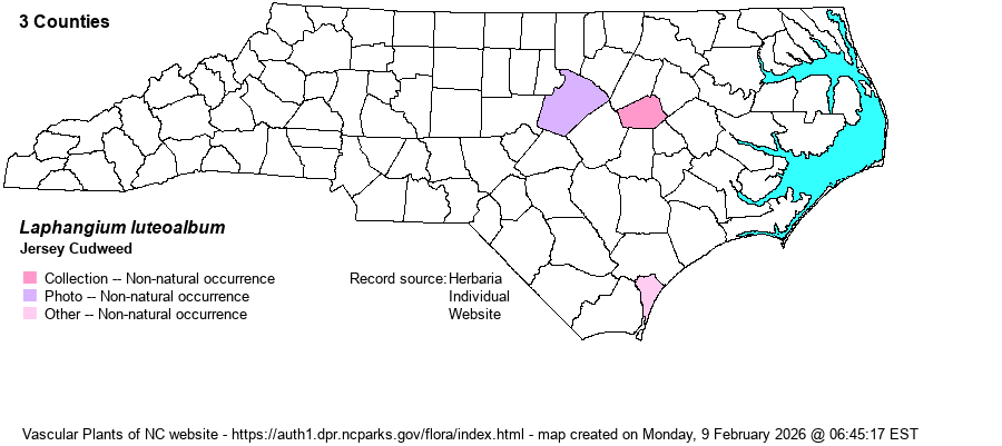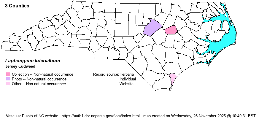 | Distribution | Collected in 2021 (NCU) by Mark and Myra Basinger in Wilson County, and photographed by Bryan England in Wake County in 2025. The iNaturalist website has at least one photo from NC that seems to confirm this exotic species -- New Hanover County -- if not a few others without an inflorescence visible.