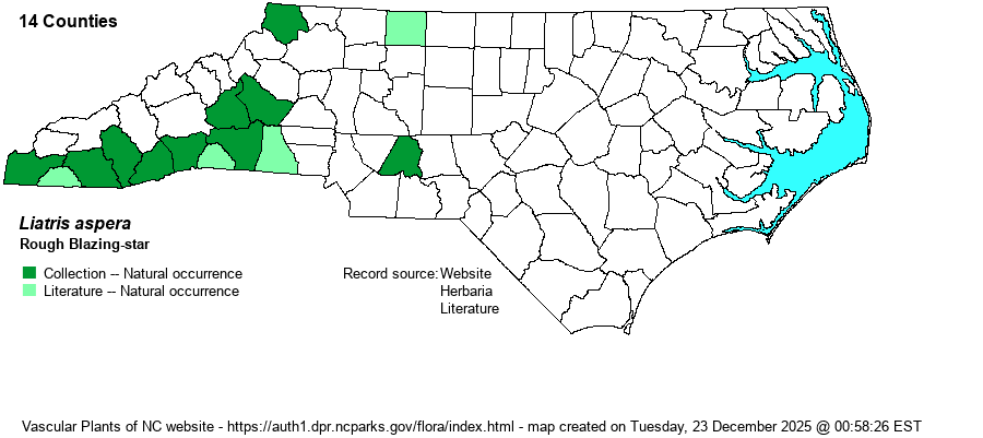 | Identification | Blazing-stars typically have single unbranched stems, many slender leaves, and a terminal spike-like inflorescence of disk florets only. They grow from very hard, roundish, underground corms. Rough Blazing-star grows 2-6 feet tall, the lower leaves narrowly elliptic and well-stalked, middle and upper leaves progressively narrower, shorter, and eventually stalkless. Heads are relatively broad, have 14-24 pink-purple florets, and involucral bracts have blunt, recurved tips. The involucres are glabrous, vs. pubescent in L. squarrulosa. As with nearly all Liatris identifications, take great care in the determination, as this is a rare one. A blazing-star in dry and often rocky places in the southwestern part of the state, growing 3 feet or taller, could well be this species. | |
