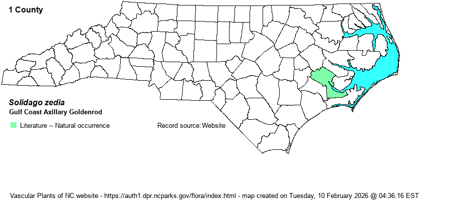 | Distribution | Limited to the southeastern Coastal Plain, near the coast. There is one Research Grade photo on iNaturalist, by Eric Ungberg in Croatan National Forest in Craven County, in November 2021. Though no specimens show in SERNEC by the species or varietal name of zedia, there might be specimens of S. caesia that may actually be this taxon.