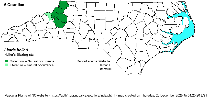| Identification | Blazing-stars typically have single unbranched stems, many slender leaves, and a terminal spike-like inflorescence of disk florets only. They grow from very hard, roundish, underground corms. Heller's Blazing-star grows only 8-12 inches tall, the lower leaves narrowly elliptic to rather spatula-shaped, with the middle and upper leaves rapidly narrower and shorter. The heads are "middling- sized", have 7-17 pink-purple florets, and involucral bracts have blunt tips. From L. microcephala it can be told by more florets per head (7-17 vs. 4-6) and from L. pilosa it can be told by stems and leaves weakly punctate-glandular (vs. usually strongly so). The latter species usually is not found growing on rocks/outcrops. See also L. turgida. | |