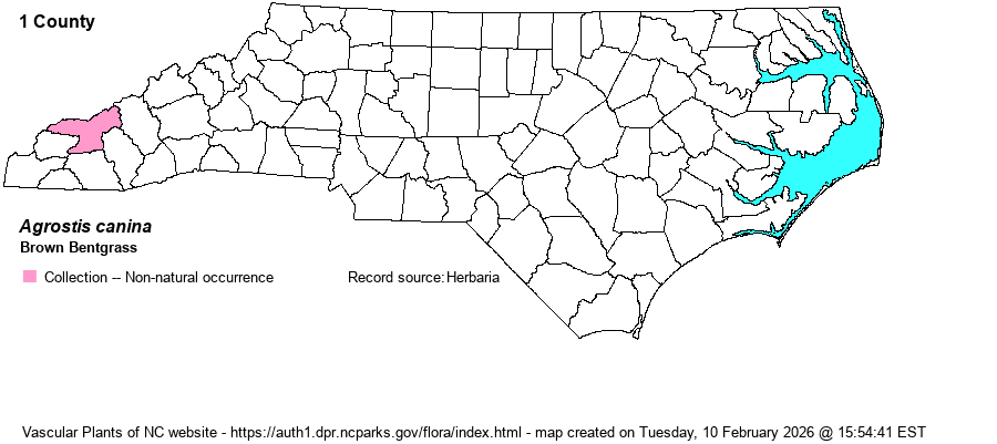 | Taxonomic Comments | Bentgrasses, genus Agrostis, in NC are usually densely cespitose (many stems and basal leaves from a central area). Most leaves are basal, rather short, and slender, often folded lengthwise or involute (rounded in cross-section). Stem leaves are few in number. The inflorescence is open and airy or wispy, with 2-several branches from well-spaced nodes; towards their ends, these branches are again branched and support the spikelets. Spikelets each contain only a single floret, with 2 glumes (outer scale-like bodies) and one lemma (inner scale-like body) and a central fruit or seed. Glumes and lemmas are sharp pointed. Lemmas may or may not have a projecting awn. In grasses, the fruit is called a caryopsis or a grain; it is composed of the seed and a tightly fitting envelope (or pericarp). | |