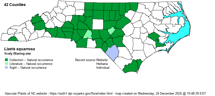 | Distribution | Piedmont and Sandhills; scarce in the low elevation Mountains and in the southern Coastal Plain. The record from Craven County is from an oak-hickory forest 6.8 miles south of New Bern. The New Hanover County specimen (NCSC) is without an image in SERNEC. A Brunswick County specimen was collected in 2022. Note that records from the southern coastal areas might not be truly native populations; and the Brunswick site was "along roadside of Camp Branch Road under powerline ROW S of Egypt Rd; perhaps planted here as a number of odd plants are growing at this location" (M. Basinger).