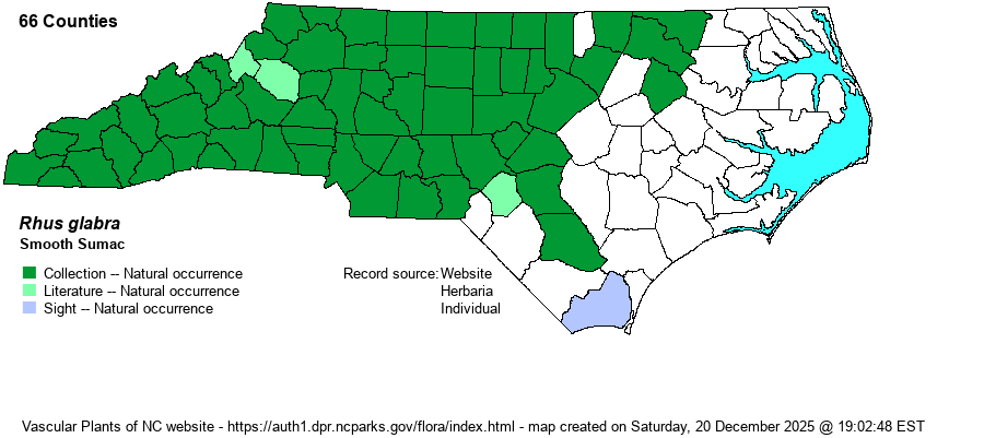| Abundance | In the Mountains and Piedmont, it is fairly common to common, though much less numerous than is Rhus copallinum. Generally rare to uncommon in the Coastal Plain portion of the range. It is typically not seen by the biologist on a daily basis, as is the latter species. | |