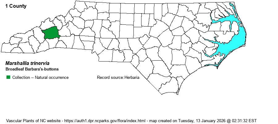 | Habitat | Moist rocky streambanks, clayey soils of montane woodlands and forests -- in shadier habitats than most other Marshallia species. | |