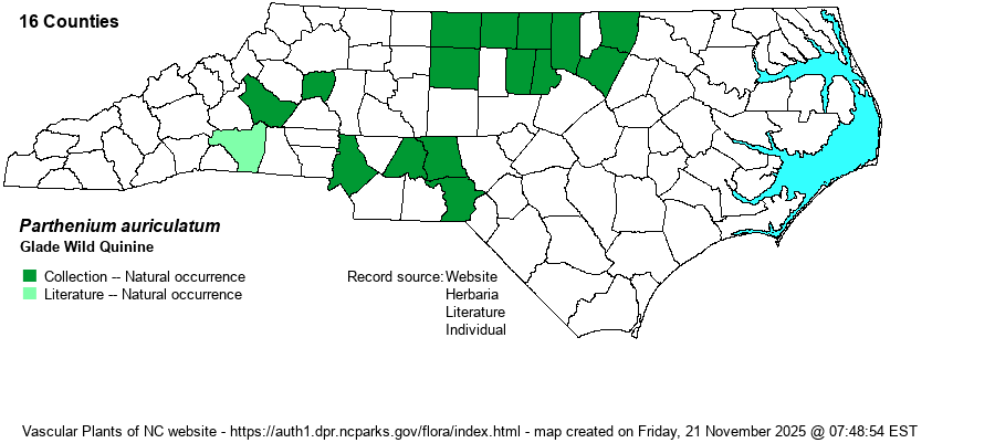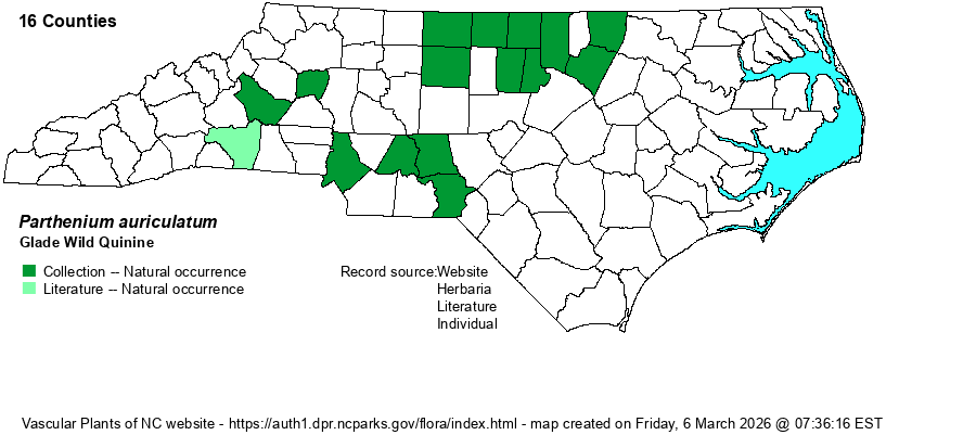 | Parthenium auriculatum | = | Parthenium integrifolium var. auriculatum | Radford, Ahles, and Bell (1968) | | | Parthenium auriculatum | = | Parthenium integrifolium var. auriculatum | Strother in FNA (2006c). | | | Parthenium auriculatum | = | Parthenium hispidum var. auriculatum | Fernald (1950) | | | Parthenium auriculatum | = | Parthenium hispidum var. auriculatum | Flora of West Virginia | | | Parthenium auriculatum | < | Parthenium integrifolium | Flora of North America (1993b, 1997, 2000, 2002a, 2002b, 2003a, 2004b, 2005, 2006a, 2006b, 2006c, 2007a, 2009, 2010) | | | Parthenium auriculatum | < | Parthenium integrifolium | Small (1933, 1938) | | | Parthenium auriculatum | < | Parthenium hispidum | Wofford (1989) | | | Source: Weakley's Flora |