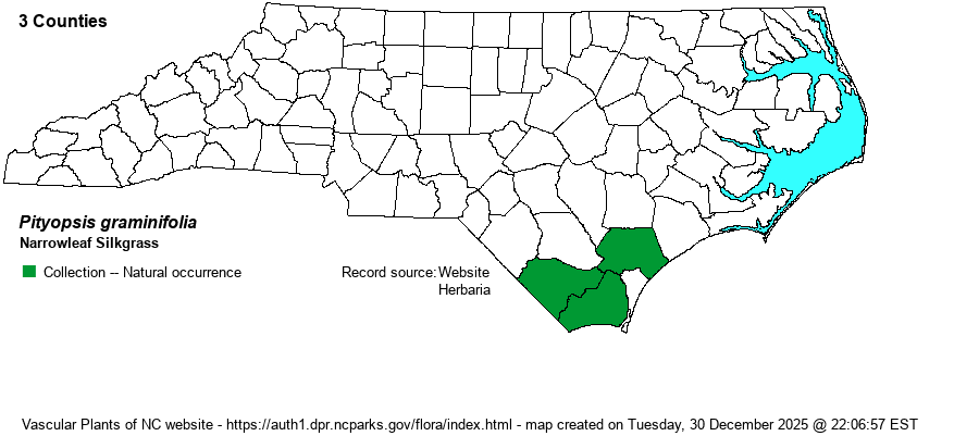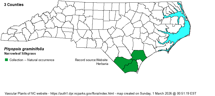| Distribution | Southern outer Coastal Plain, known from just 3 counties so far. A 1934 specimen at NCU from "dry woods, Nakina," Columbus County, was originally determined as Chrysopsis argentea and finally annotated in 2020. Sadly, SERNEC contains many dozens of specimens still labeled as the former P. graminifolia -- mainly now assigned to P. aspera if not also P. nervosa -- such that careful study of the specimens is badly needed. One of the editors (Sorrie) has done much of that, winnowing these specimens to now just 3 counties. In addition, iNaturalist also is unreliable for determining species of this genus owing to numerous splitting and renaming of species.