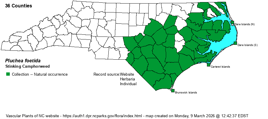 | Identification | Camphorweeds are leafy plants about 2 feet tall with generally flat-topped inflorescences of pink, rosy, or dirty white heads. The vegetation has an unpleasant odor, often described as fetid. Stinking Camphorweed has dirty white heads (disk florets only) and stalkless/clasping, dull green or brownish green leaves. It looks much like Rosy Camphorweed (P. baccharis), but the leaves never are glaucescent and the heads are not pink or rosy. The other two NC species in the genus have leaves with short petioles or are tapered to the base, and are not sessile/clasping. | |