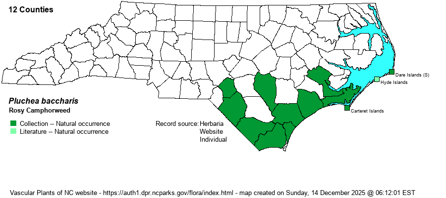 | Identification | Camphorweeds are leafy plants about 2 feet tall with rather flat-topped inflorescences of pink, rosy, or dirty white heads. The vegetation has an unpleasant odor, often described as fetid. Rosy Camphorweed has medium to pale pink heads (of disk florets only) and stalkless to clasping, distinctly glaucescent leaves. Stinking Camphorweed (P. foetida) is very similar in size and shape, but its heads are dirty white and the leaves are dull, dark green. The other two Pluchea species in the state have leaves with petioles or are narrowly cuneate at the base (as opposed to sessile/clasping leaves). | |