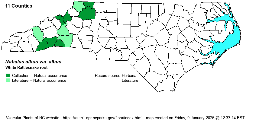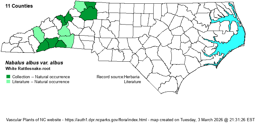 | Distribution | North American species formerly in the genus Prenanthes have now been assigned to the genus Nabalus. Sorrie & LeBlond (2025, see References) indicate that records of the old "Prenanthes alba ssp. pallida" in the NC outer Coastal Plain are now assignable to Nabalus albus var. stramineus. See the separate account for that variety. Only Nabalus albus var. albus, is shown on the range map below.