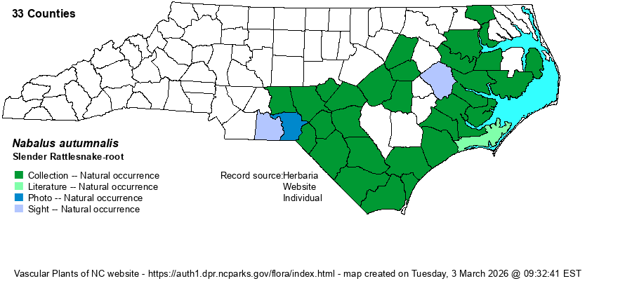| Nabalus autumnalis | = | Prenanthes autumnalis | Gleason and Cronquist (1991) | | | Nabalus autumnalis | = | Prenanthes autumnalis | Fernald (1950) | | | Nabalus autumnalis | = | Prenanthes autumnalis | Flora of North America (1993b, 1997, 2000, 2002a, 2002b, 2003a, 2004b, 2005, 2006a, 2006b, 2006c, 2007a, 2009, 2010) | | | Nabalus autumnalis | = | Prenanthes autumnalis | Gleason (1952) | | | Nabalus autumnalis | = | Prenanthes autumnalis | Kartesz (1999) | | | Nabalus autumnalis | = | Prenanthes autumnalis | Radford, Ahles, and Bell (1968) | | | Nabalus autumnalis | = | Prenanthes autumnalis | Vascular Flora of the Southeastern States (Cronquist 1980, Isely 1990) | | | Nabalus autumnalis | = | Prenanthes autumnalis | Wunderlin & Hansen Flora of Florida (3) | | | Nabalus autumnalis | = | Prenanthes autumnalis | Lack in Kadereit & Jeffrey (2007). Key adapted from C and SE, in part. | | | Nabalus autumnalis | = | Nabalus virgatus | Small (1933, 1938) | | | Source: Weakley's Flora |