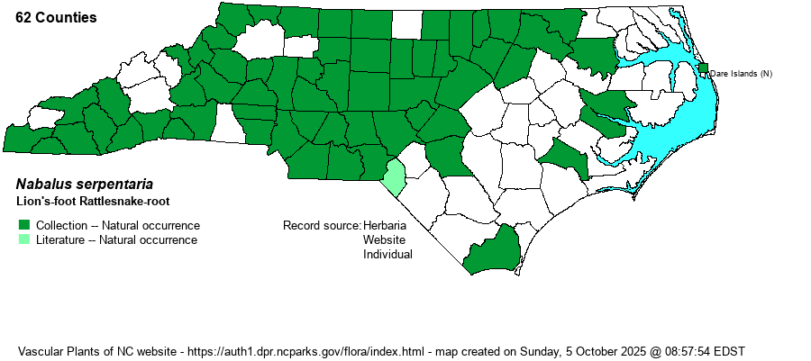 Taxonomic Comments | None, though it was named as Prenanthes serpentaria in previous references. Weakley (2022) explained the change from serpentarius to serpentaria.