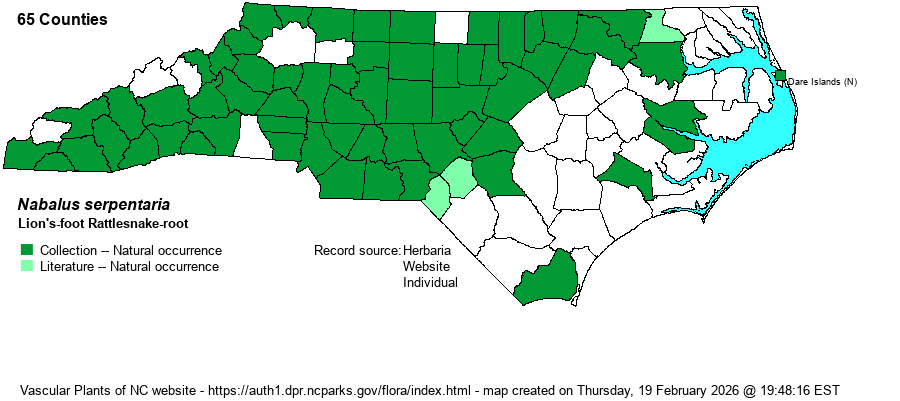 | Taxonomic Comments | None, though it was named as Prenanthes serpentaria in previous references. Weakley (2022) explained the change from serpentarius to serpentaria.