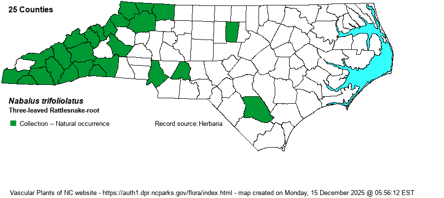 | Nabalus trifoliolatus | = | Prenanthes trifoliolata | Gleason and Cronquist (1991) | | | Nabalus trifoliolatus | = | Prenanthes trifoliolata | Flora of North America (1993b, 1997, 2000, 2002a, 2002b, 2003a, 2004b, 2005, 2006a, 2006b, 2006c, 2007a, 2009, 2010) | | | Nabalus trifoliolatus | = | Prenanthes trifoliolata | Gleason (1952) | | | Nabalus trifoliolatus | = | Prenanthes trifoliolata | Kartesz (1999) | | | Nabalus trifoliolatus | = | Prenanthes trifoliolata | | | | Nabalus trifoliolatus | = | Prenanthes trifoliolata | Vascular Flora of the Southeastern States (Cronquist 1980, Isely 1990) | | | Nabalus trifoliolatus | = | Prenanthes trifoliolata | Wofford (1989) | | | Nabalus trifoliolatus | = | Prenanthes trifoliolata | Lack in Kadereit & Jeffrey (2007). Key adapted from C and SE, in part. | | | Nabalus trifoliolatus | > | Prenanthes trifoliolata | Radford, Ahles, and Bell (1968) | | | Nabalus trifoliolatus | > | Prenanthes alba ssp. pallida | Radford, Ahles, and Bell (1968) | | | Nabalus trifoliolatus | > | Prenanthes alba ssp. pallida | | | | Nabalus trifoliolatus | > | Prenanthes trifoliolata var. trifoliolata | Fernald (1950) | | | Nabalus trifoliolatus | = | Nabalus trifoliatus | Small (1933, 1938) | , orthographic variant | | Source: Weakley's Flora |