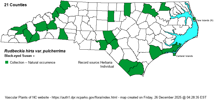 | Rudbeckia hirta var. pulcherrima | > | Rudbeckia hirta var. pulcherrima | Perdue (1957)=Z. Key adapted in part from SE and FNA. | |