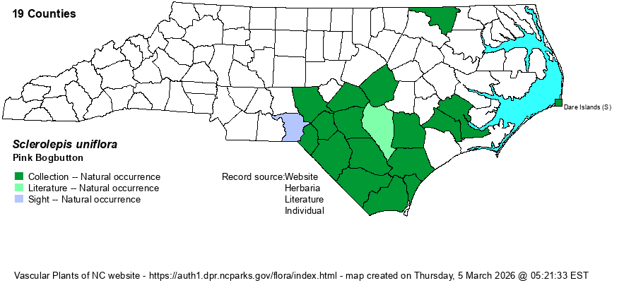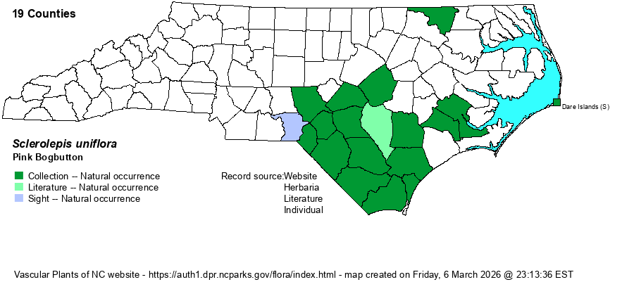 | Distribution | Southern Coastal Plain and Sandhills; disjunct to Northampton County (bog on NC 46 at/near Vultare) and Dare County (Roanoke Island, Burnside, fresh water pond).