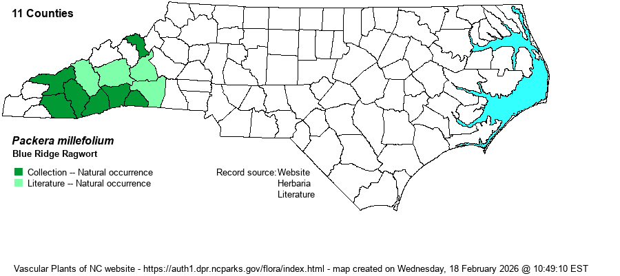 | Packera millefolium | = | Senecio millefolium | Gleason and Cronquist (1991) | | | Packera millefolium | = | Senecio millefolium | Fernald (1950) | | | Packera millefolium | = | Senecio millefolium | Small (1933, 1938) | | | Packera millefolium | = | Senecio millefolium | Radford, Ahles, and Bell (1968) | | | Packera millefolium | = | Senecio millefolium | Vascular Flora of the Southeastern States (Cronquist 1980, Isely 1990) | | | Packera millefolium | = | Senecio millefolium | Mahoney & Kowal (2008). | | | Packera millefolium | = | Packera millefolia | Flora of North America (1993b, 1997, 2000, 2002a, 2002b, 2003a, 2004b, 2005, 2006a, 2006b, 2006c, 2007a, 2009, 2010) | , orthographic variant | | Packera millefolium | = | Packera millefolia | | , orthographic variant | | Packera millefolium | = | Packera millefolia | Mahoney & Kowal (2008). | , orthographic variant | | Source: Weakley's Flora |