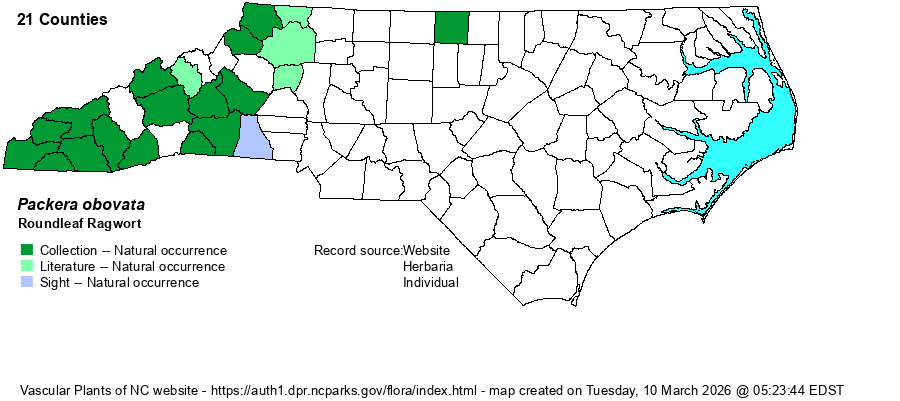 | Identification | Roundleaf Ragwort has basal leaves that are broadly elliptical to obovate (with outer portion broadest), not strongly toothed nor dissected. Plants are rather short, rarely 2 feet tall. Of our ragworts, only P. aurea and P. serpenticola have such broad and uncut basal leaves, but theirs are round in outline and with heart-shaped bases. P. paupercula has much narrower basal leaves (narrowly elliptical). This species has somewhat restricted habitats, requiring fairly high pH soils near rocks, mainly in shaded situations, and thus it is somewhat local in its montane range in the state, with some heavily botanized counties still lacking specimen records. | |