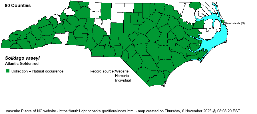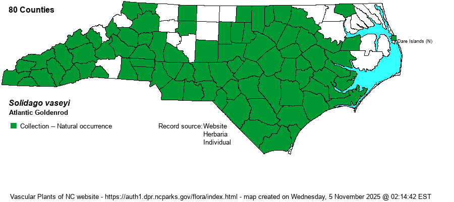 | Distribution | Essentially throughout the state, except scarce in the northeastern corner. NOTE: Weakley (2022) treats this entity as S. vaseyi (A. Gray) Heller.