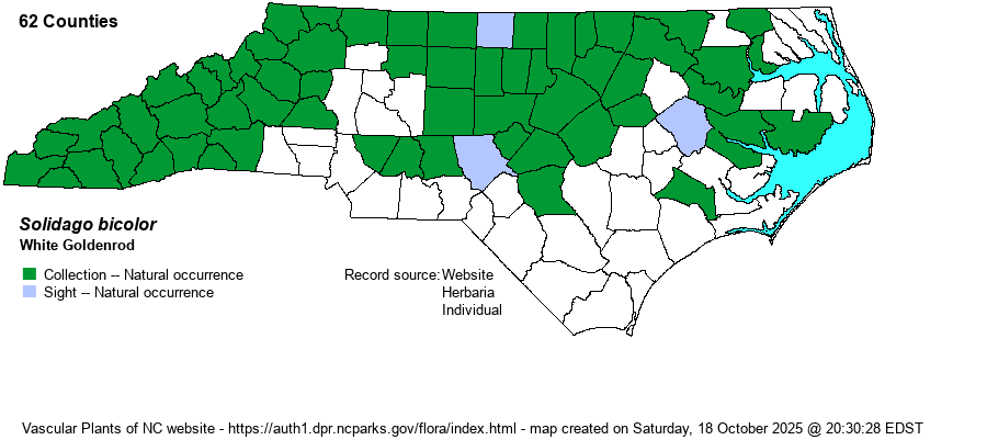 Identification | White Goldenrod and White Prairie Goldenrod (S. ptarmicoides) are our only goldenrods with white ray florets. White Prairie Goldenrod has linear and untoothed leaves, whereas White Goldenrod has lance-shaped to elliptic and toothed leaves. Much more similar, when not in flower, is Slender Goldenrod (S. erecta), but it has smooth stems (vs. hairy at least basally in S. bicolor). This is a familiar plant to most biologists, and the creamy white to dull white (not bright white) flowering spike is quite distinctive. | |