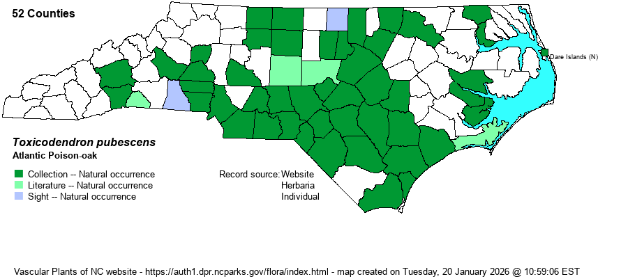 | Distribution | Occurs nearly throughout the Coastal Plain and Piedmont, but scarce in the southern Mountains, only at lower elevations. Range maps are likely incomplete for this and the other two Toxicodendron species due to hesitancy of biologists to collect plants for fear of contact dermatitis. Relatively few county records for the eastern Coastal Plain, where suitable habitat (dry/upland forests) is more limited than farther inland and to the south.