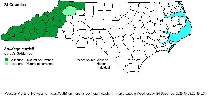 | Solidago curtisii | > | Solidago curtisii var. curtisii | Fernald (1950) | | | Solidago curtisii | > | Solidago curtisii var. curtisii | Gleason (1952) | | | Solidago curtisii | > | Solidago curtisii var. pubens | Fernald (1950) | | | Solidago curtisii | > | Solidago curtisii var. pubens | Gleason (1952) | | | Solidago curtisii | > | Solidago curtisii var. pubens | Radford, Ahles, and Bell (1968) | | | Solidago curtisii | = | Solidago curtisii var. curtisii | Flora of North America (1993b, 1997, 2000, 2002a, 2002b, 2003a, 2004b, 2005, 2006a, 2006b, 2006c, 2007a, 2009, 2010) | | | Solidago curtisii | < | Solidago curtisii | Kartesz (1999) | (also see S. lancifolia) | | Solidago curtisii | < | Solidago curtisii var. curtisii | Radford, Ahles, and Bell (1968) | (also see S. lancifolia) | | Solidago curtisii | > | Solidago curtisii | Small (1933, 1938) | | | Solidago curtisii | > | Solidago pubens | Small (1933, 1938) | | | Solidago curtisii | = | Solidago caesia var. curtisii | | | | Source: Weakley's Flora |