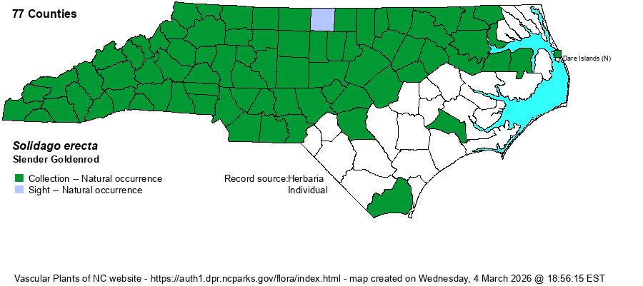 | Identification | While Slender Goldenrod can appear "ordinary" for a goldenrod, it has one unusual feature: stems and leaves are smooth (hairless), except for tiny hairs in the inflorescence branches. Plants grow mostly 2-4 feet tall from narrowly ovate, stalked basal leaves; stem leaves become smaller, narrower, and sessile upwards. The inflorescence is elongate and narrowly conical, with generally erect branches. Many plants tend to have light yellow rays, as opposed to rich "goldenrod" yellow rays, a character than can often be seen from some distance. Showy Goldenrod (S. speciosa) is similar in the field, but may reach 6 feet, and has a broader, more crowded, and showier inflorescence. That species usually has larger/longer basal leaves, as well -- sometimes reaching 6-8 inches long. | |