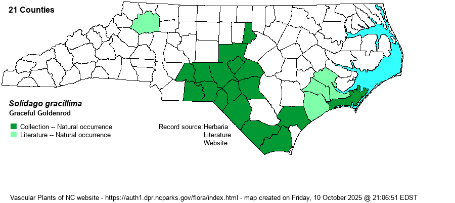 Distribution | There is no consensus yet among botanists that Graceful Goldenrod and Southern Goldenrod (S. austrina) are truly two distinct species or even varieties. This website follows Weakley (2020) for now and lists both entities as full species; however, in theory, the website editors feel that until the dust settles, it is best to lump the two, with the name S. gracillima having priority. Those who wish to distinguish the two can use the key in Weakley (2020). In NC, it occurs mainly in the Sandhills, lower Piedmont, and southeastern Coastal Plain. No records for the northern half of the Coastal Plain, despite it being listed for VA. However, the Digital Atlas of the Virginia Flora website does not include this species.