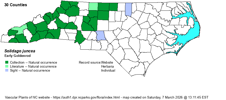| Distribution | Mountains east to the central Piedmont. The map below is tentative; a number of specimens purported to be Early Goldenrod turn out to be S. pinetorum (e.g., Wake County) or some other species (and those counties are thus deleted), while others that have been mapped need to be double-checked.