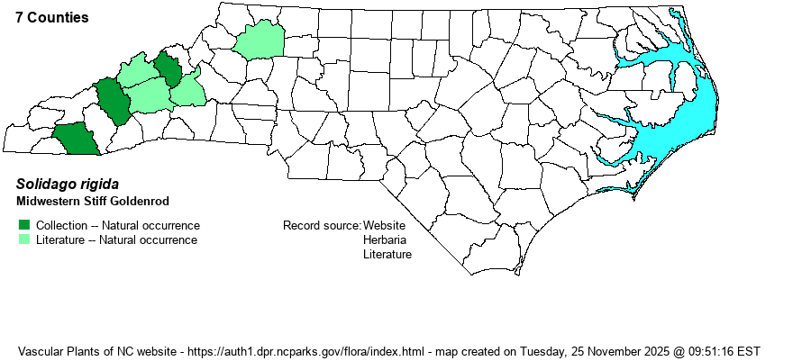 | Distribution | In NC, restricted to the Mountains and barely into the Piedmont foothills. Weakley (2018) maps it also in the Piedmont, but specimens need to be closely examined. A Swain County specimen (at CONV) is misidentified. This is the taxon formerly listed as Oligoneuron rigidum var. rigidum, now elevated to full species by Weakley (2020). But, in 2022, Weakley moved the genus members back to Solidago -- this now as S. rigida. NCNHP uses the name of Oligoneuron rigidum.