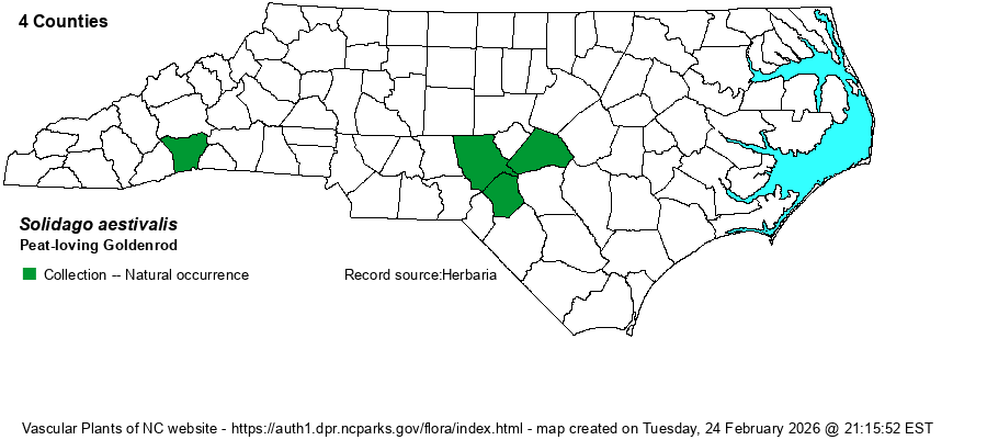 | Abundance | Very poorly known by botanists and other biologists, as this is a recent split off of the large complex named as S. rugosa. Rare to uncommon in the Sandhills, and very rare in the southern Mountains. It is considered as a Watch List species. | |