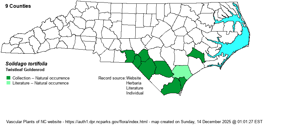 | Identification | Twistleaf Goldenrod grows 1.5-2.5 (-3) feet tall from long, narrow horizontal rhizomes -- and thus often forms dense patches. Leaves are all along the stem (no basal ones), numerous, linear to narrowly elliptic, 1-3 inches long, generally stalkless, margins with small teeth, and often twisted. Also, the many dozens of leaves are all about the same length, from bottom to top of the stem. The inflorescence varies from short and triangular in outline to longer and with short, curved branches. No other goldenrod looks quite like it, with the dozens to seemingly 100 or more short, narrow, step-like leaves -- making the inflorescence look overly large and too big to support. | |