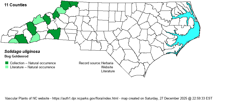 | Distribution | Mountains only. Specimen record from Clay (at NY) is misidentified. Non-specimen records from Clay, Madison, Transylvania, and Watauga counties need vetting -- though the habitat descriptions (in the NCNHP database) for the populations in Clay, Transylvania (3), and Watauga (2) counties are for bogs and other wetlands and thus seem legitimate observations. Specimens from Buncombe, Burke and Haywood counties need an ID check. Records at USDA from Alleghany and Rutherford counties are not supported by specimens at SERNEC.