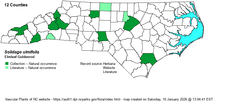 | Distribution | Though this is a distinct species, at least north of NC, there are many specimen records from across much of the state that have either been misidentified or might be misidentified (though difficult to be certain from review of specimens online), especially based on range or habitat. The identity of Elmleaf Goldenrod is unclear to the taxon editors. Specimens are not very consistent in their characters. Some specimens at SERNEC that were labeled as ulmifolia turn out to be S. rugosa var. rugosa, rugosa var. aspera, juncea, and latissimifolia (this last from Moore Co. at 16 herbaria!!). The range map below no doubt contains more records than in reality, as this is a northern species that is likely very rare in NC. Specimens checked at SERNEC in Jan. 2023 from Forsyth and Chatham counties are misidentified. Since none of the specimens at SERNEC have been annotated by Solidago experts, all NC records should be vetted. In a Feb 2023 email, Eric Ungberg and Vanessa Voelker of KYNHP agreed that a second specimen from Forsyth County (PH00255424 at Drexel Herbarium) is correctly identified. Eric and Vanessa doubted the ID of the other NC specimens at SERNEC, but cannot be positive until they are examined in hand.