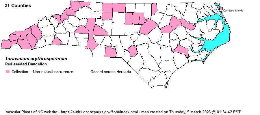 | Abundance | Uncommon in the Mountains and Piedmont, rare in the Coastal Plain. No doubt overlooked as Common Dandelion (T. officinale) and will be found in many other counties, as the range is nearly statewide and the gaps make no biological sense, other than rare to absent in the southern Coastal Plain. | |