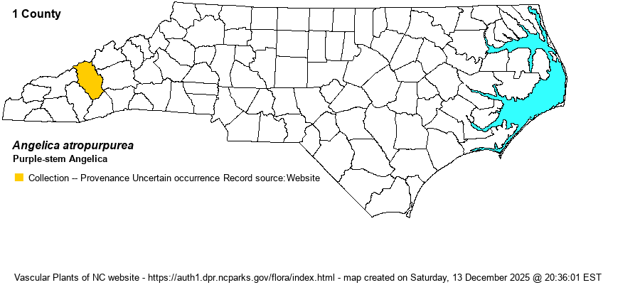 | Identification | This is one of the state's most robust "native" herbaceous species, growing to 5-6 feet tall or higher. It has a smooth dark purple stem. The scattered alternate leaves are very long, about 8 inches long, but all leaves are pinnately divided or doubly-pinnate divided, into numerous elliptical or lanceolate leaflets. Each leaflet is about 3-4 inches long and about 1-inch wide, with serrated margins. The large umbel at the top of the stem has 20-45 rays each with a smaller umbel, and each ray (umbel stem) is about 2 inches long and spreading, such that the entire umbel is about 6 inches across in a shallowly rounded dome. The flowers are white. Despite this being what should be an obvious identification, the much more numerous A. triquinata is also found in the mountains; it is smaller, up to about 4 feet tall, is not quite as deeply dissected, the leaflets tend to have acuminate tips (as opposed to acute in this species), and it has fewer ray and small umbels (13-25 as opposed to 20-45 in A. atropurpurea). Lastly, A. atropurpurea has leaflets with a hyaline margin (a colorless and smooth narrow band along the edge of a leaf -- almost like a fingernail) whereas A. triquinata has a ciliate margin. You will need to hold a leaflet up to light and examine in a hand lens to see a hyaline margin. Do not confuse these with Heracleum maximum, which is very robust but has leaflets that look like maple leaves, or with Cicuta species -- especially C. maculata, which can be locally common in wet ground in the mountains. | |