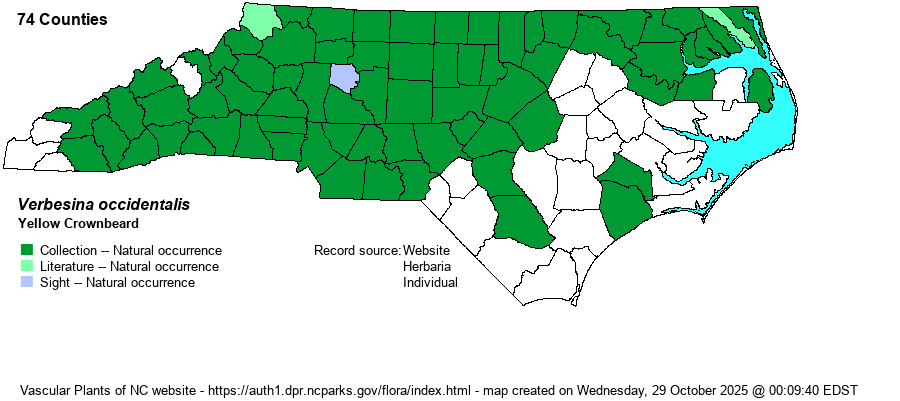 | Identification | Yellow Crownbeard is easily identified by its tall stems 3-8 feet tall. Leaves are numerous, opposite, lance-shape or elliptic, sharply toothed, and strongly narrowed to a stalk (from a somewhat truncate base). The leafstalks are somewhat decurrent onto the stem as wings. Heads are numerous in an open array, and large -- ray florets are 1-3 cm long and bright yellow. The disks are prominent, dome-shape, and yellow. The rays are often twisted and thus the flowers look "unkempt". Wingstem (V. alternifolia) is very similar but always has alternate leaves. Both species seem to be increasing, at least spreading in wetland clearings such as sewerline margins. In fact, both can be somewhat weedy, as each can quickly invade man-made clearings in wetlands. | |