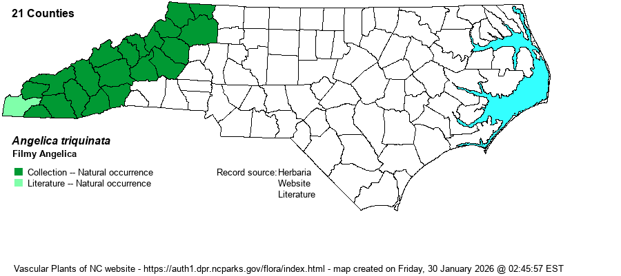 | Identification | This is a rather tall and robust herb, growing to 4-5 feet tall on average. It has scattered alternate leaves, each up to 6-8 inches long, usually once-pinnate, with each leaflet being heavily serrated on the margins, elliptical to lanceolate in shape, about 4-5 inches long and 1.5-2 inches wide, with acuminate tips. The large umbel topping the stem has 13-25 rays/umbellets, each with white flowers, and the full umbel has a spread of about 4 inches in a gently rounded dome shape. It is smaller in overall appearance than the very robust A. atropurpurea, which is of uncertain provenance in NC; that species grows to 5 feet tall or more and has 20-45 rays in the umbel. A. triquinata leaflets have a ciliate margin and no hyaline margin (thin, smooth, and colorless margin), whereas leaflets in A. atropurpurea do, so you may need a hand lens to check this character. Heracleum maximum is also very robust but its leaflets are maple-like, and it grows in damp or flat ground, whereas A. triquinata is an upland species. Most biologists should be quite familiar with this species, as long as they spend time in the higher elevations in summer and fall. | |
