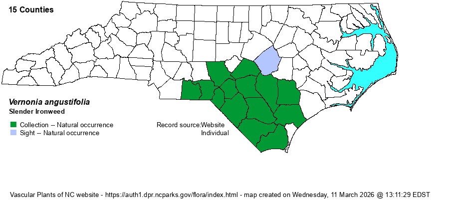 | Other Common Name(s) | Tall Ironweed, Carolina Slender Ironweed, Narrowleaf Ironweed. This species has Tall Ironweed as its most prevalent name, but this is a misnomer, as other species are much taller. Also, V. gigantea -- often still named as V. altissima -- is often rightfully called Tall Ironweed (secondary to the more often used Giant Ironweed). To avoid confusion and to provide a much better name, the website follows Sorrie (2011) and uses Slender Ironweed as the best common name for V. angustifolia. | |