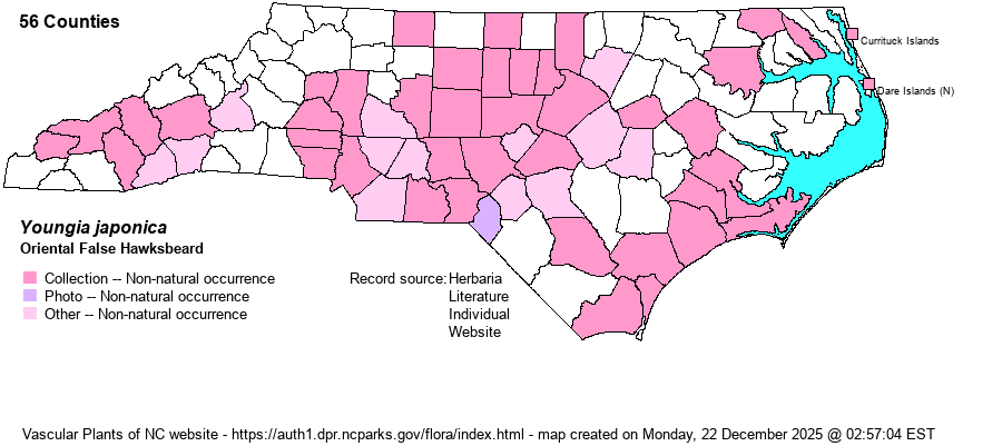 | Taxonomic Comments | The Pasquotank collection is the sole representative of Y. thunbergiana in NC, but the published differences from Y. japonica are not convincing. A synonym is Crepis japonica; when RAB (1968) was published, only a single county (Pasquotank) was listed for it!