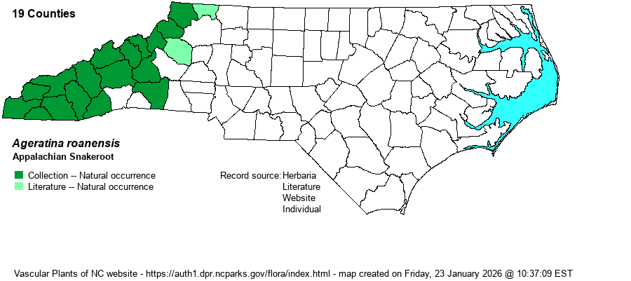 | Abundance | Weakley (2018) says often abundant at high elevations. This species was included with A. altissima in RAB (1968), and thus some confusion of identity and thus abundance between these two species might still be present with collections and photographs. The latter species is the primary one found in the lower elevations in the Mountains. | |