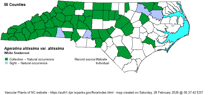 | Ageratina altissima var. altissima | = | Eupatorium rugosum var. rugosum | Vascular Flora of the Southeastern States (Cronquist 1980, Isely 1990) | |