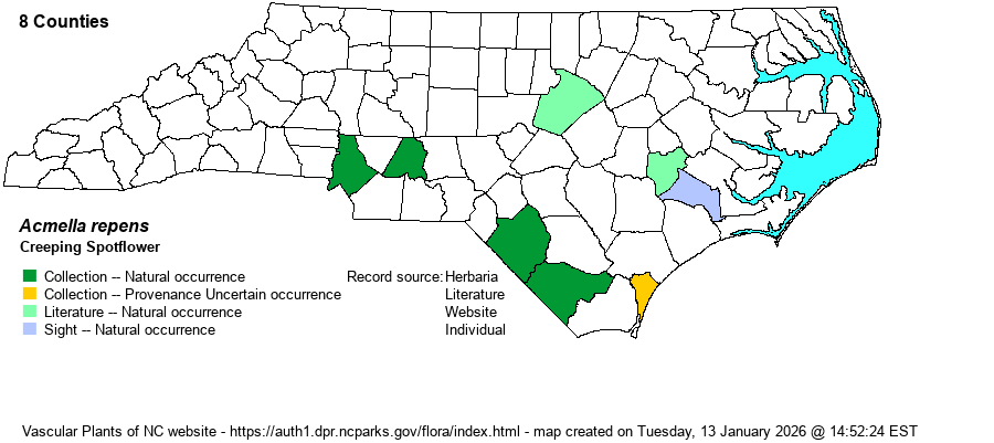 | Taxonomic Comments | For many years treated as Spilanthes americana . A synonym is Acmella oppositifolia var. repens.